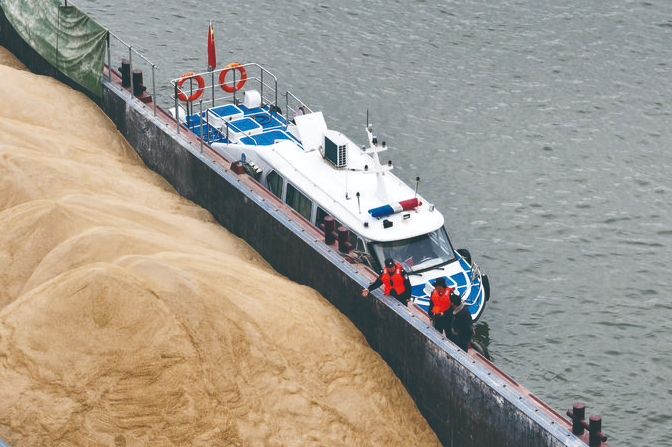 圖為民警在運河裝卸碼頭對運輸?shù)竟鹊拇贿M(jìn)行安全檢查。